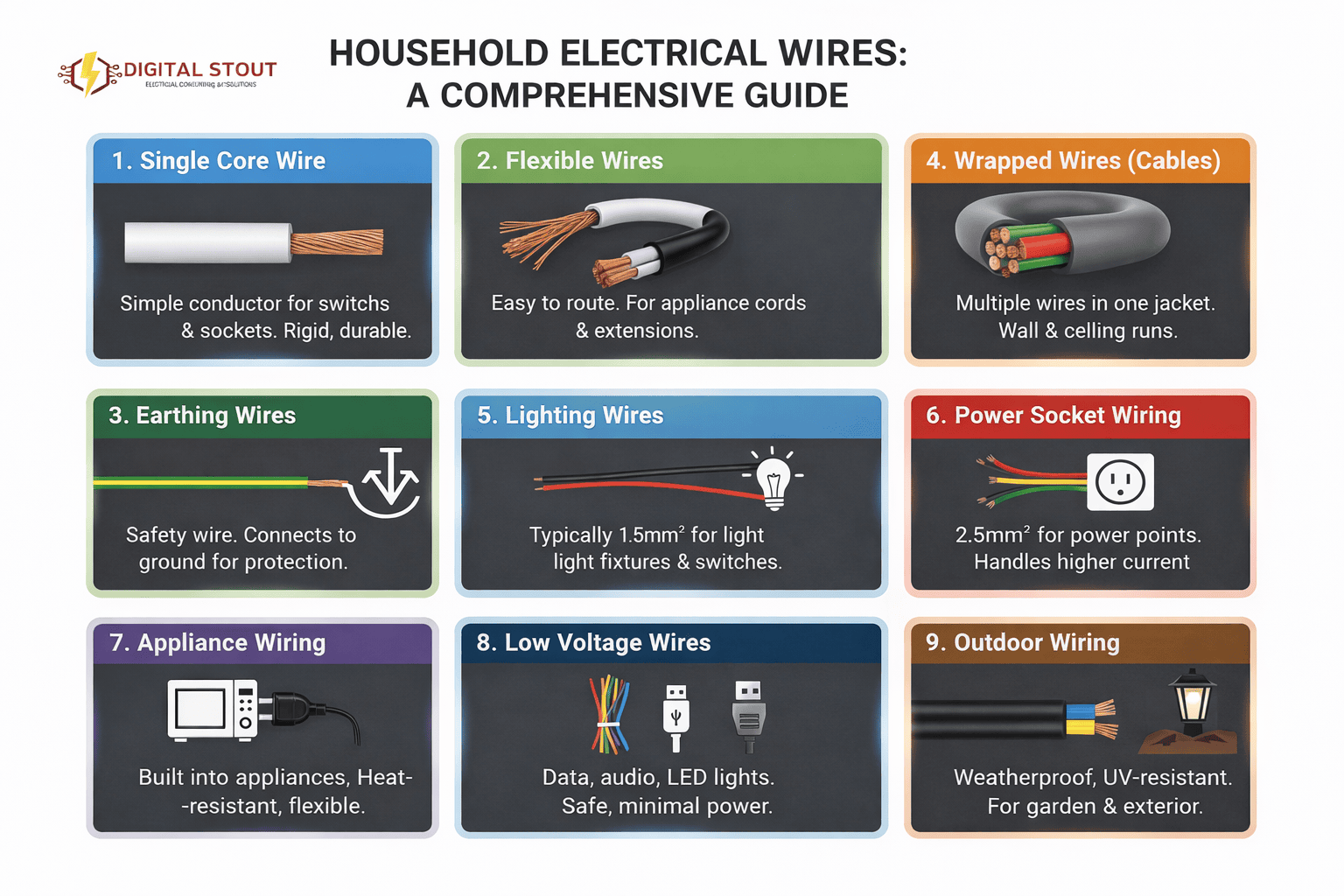 These need thicker conductors. Using lighting wires for sockets is a mistake that hides until load increases. This is where understanding types of wire saves you from invisible risk.